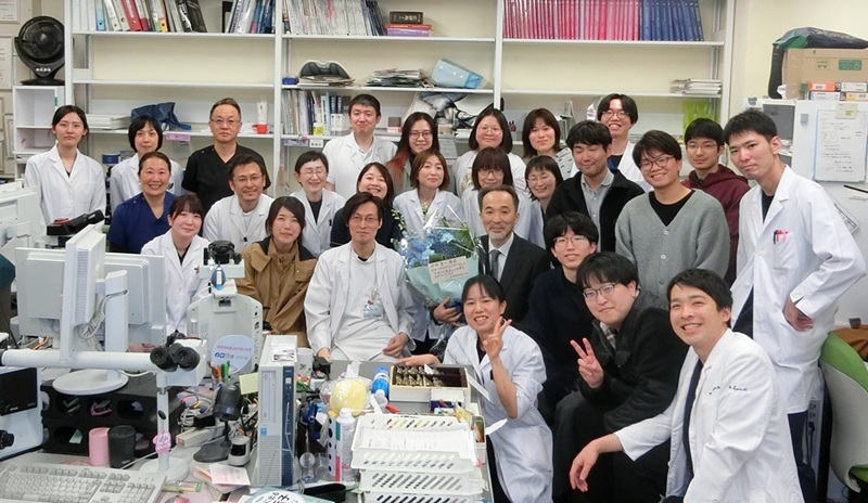 覚道健一教授(平成2年~平成23年3月)、村田晋一教授(平成24年~)と55年超にわたる歴史ある教室です。初期には基礎的内容を中心とした幅広い研究が行われてきましたが、前教授・覚道健一先生の時代からは、大学の教室名を病理学第二教室、大学院の教室名を人体病理学教室と標榜し、病理学の中でも臨床病理学に重点を置いた研究を行うようになりました。さらに、村田晋一教授赴任後、2015年1月からは、新設された附属病院病理部と合体し、基礎系講座から臨床系講座に所属変更となり、附属病院の病理診断を担当することになりました。教室名は大学および大学院共に人体病理学教室、附属病院の科名は病理診断科を、標榜することになりました。なお、病理学第一教室は病理学教室となり、第一・第二教室という名称は無くなりました。今後、人体病理学教室は、臨床講座の一員として、臨床病理学や病理診断学を教室の中心テーマとし、研究、教育、病理診断を行っていきます。